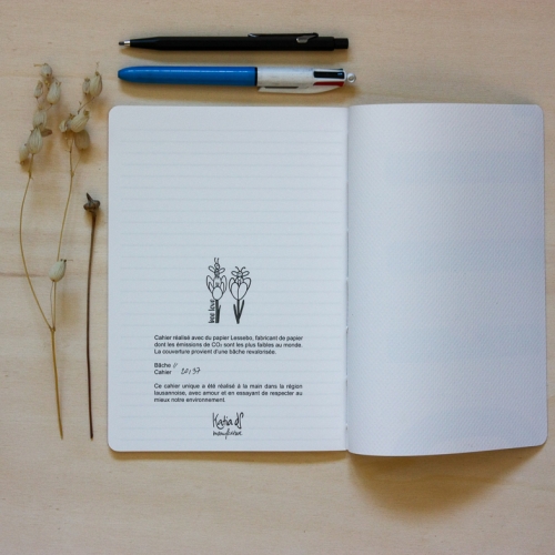 Ce cahier unique a été réalisé à la main dans la région lausannoise, avec amour et en essayant de respecter au mieux notre environnement.