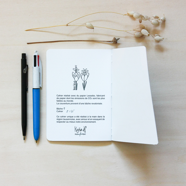 Ce cahier unique a été réalisé à la main dans la région lausannoise, avec amour et en essayant de respecter au mieux notre environnement.