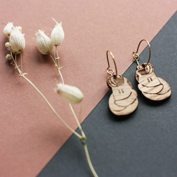 Les créoles sont en acier inoxydable plaqué or et sont légères car les personnages sont en bois de chêne. Evitez de les mettre dans l'eau.