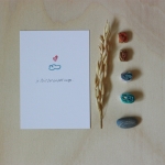 Carte réalisée avec des tampons et écriture à la main. Les tampons ont été gravés à la main.