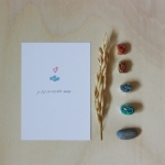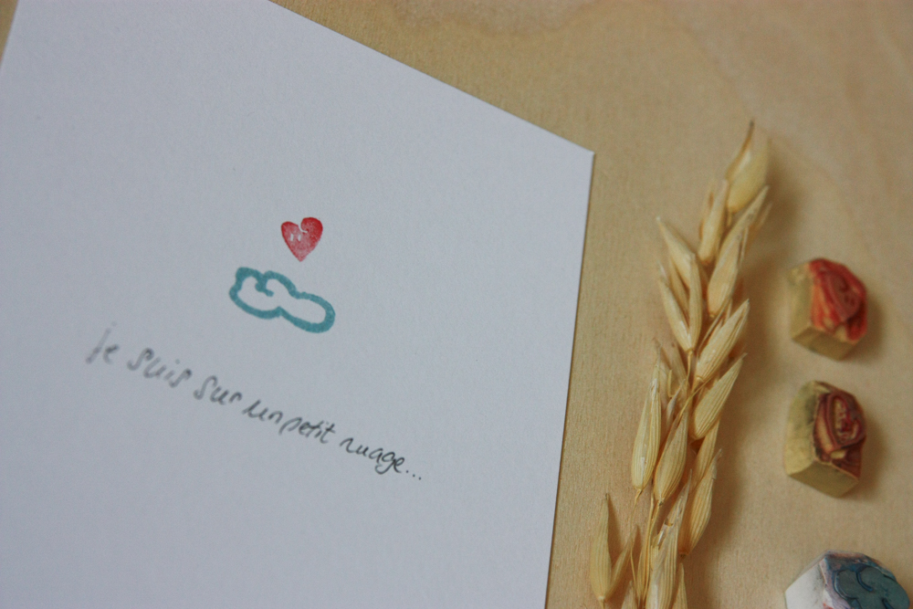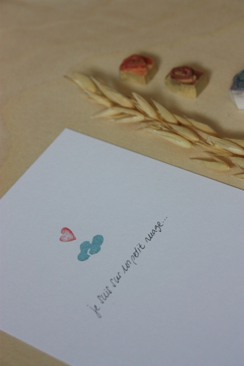 Carte réalisée avec des tampons et écriture à la main. Les tampons ont été gravés à la main.