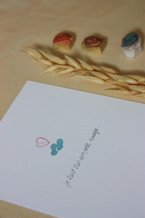 Carte réalisée avec des tampons et écriture à la main. Les tampons ont été gravés à la main.