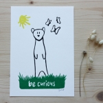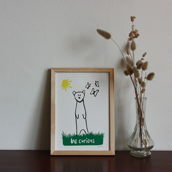 Linogravure "Be curius" nous rappel d'être curieux de manière amusante et mignonne. C'est une petite hermine qui est curieuse de ce qui l'entoure. Elle vit chez nous en Suisse.