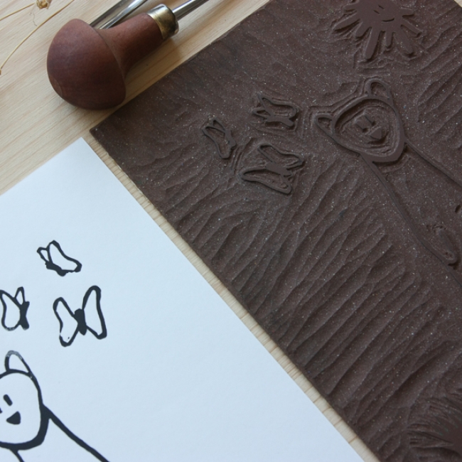 - Dessin : Le processus commence par le dessin de l'image directement sur une plaque de linoléum ou sur un papier calque qui sera transféré.