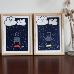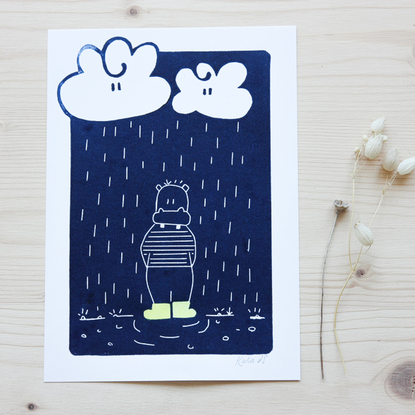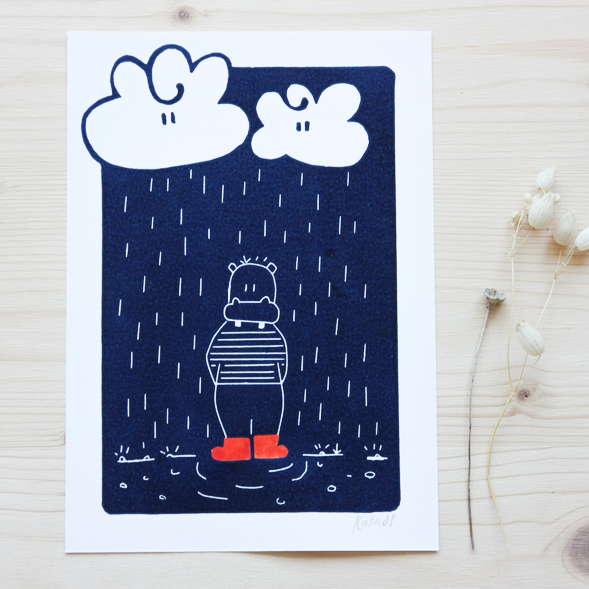 Linogravure "Hippopotame sous la pluie" est imprimé dans un bleu profond pour faire ressortir la douceur de la pluie. Tu entends les gouttes qui tombent ? Il y a deux choix possibles pour les bottes de pluie, oui, parce que j'aime bien donner le choix. Rouge ou jaune.