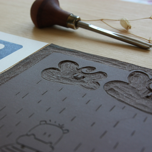 - Dessin : Le processus commence par le dessin de l'image directement sur une plaque de linoléum ou sur un papier calque qui sera transféré.