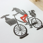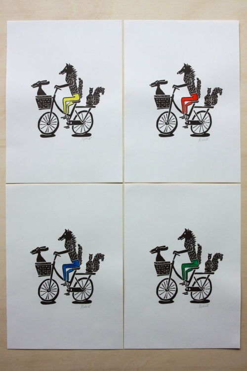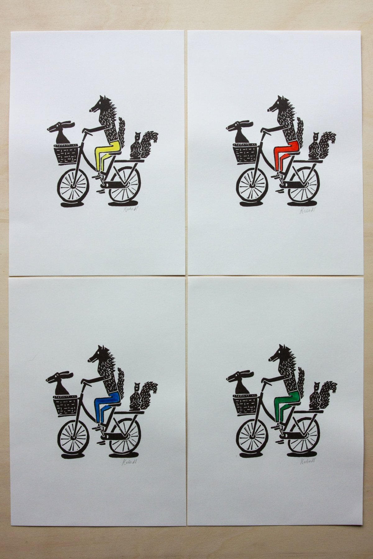 J'ai créé cette série de linogravures représentant des animaux de chaque continent, se déplaçant de manière non-polluante. Chaque œuvre met en scène trois animaux associés à un continent particulier, utilisant des moyens de transport dits "verts" ou de mobilité douce, comme le vélo, le bateau à voile ou la planche à roulette.