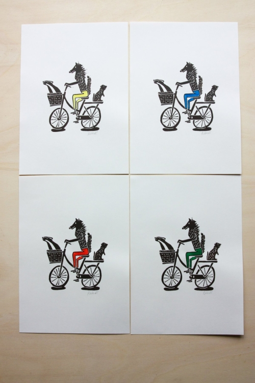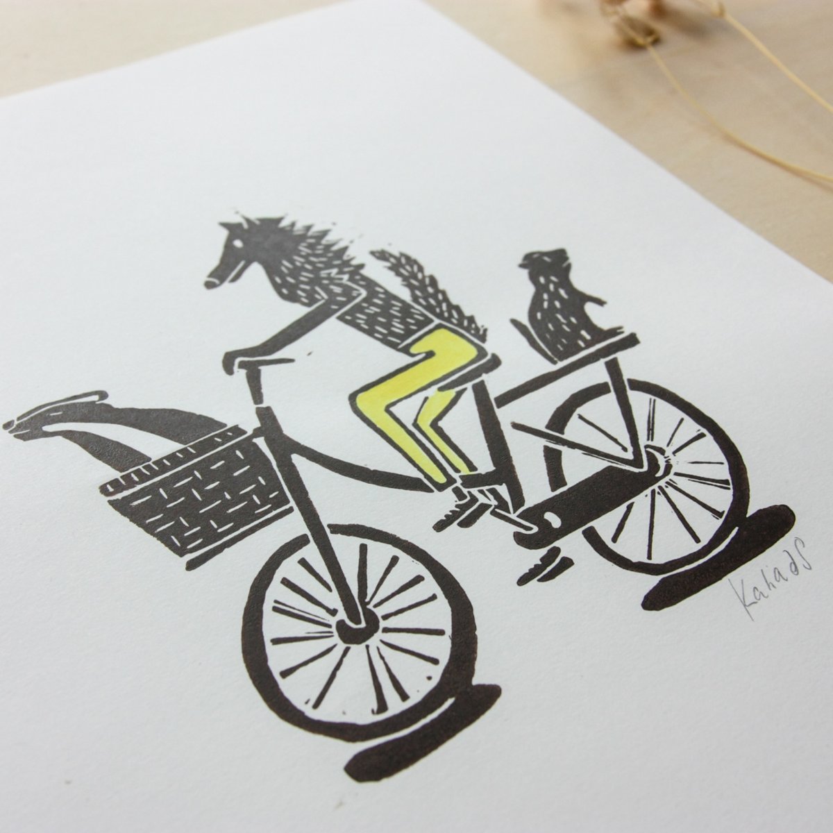 J'ai créé cette série de linogravures représentant des animaux de chaque continent, se déplaçant de manière non-polluante. Chaque œuvre met en scène trois animaux associés à un continent particulier, utilisant des moyens de transport dits "verts" ou de mobilité douce, comme le vélo, le bateau à voile ou la planche à roulette.