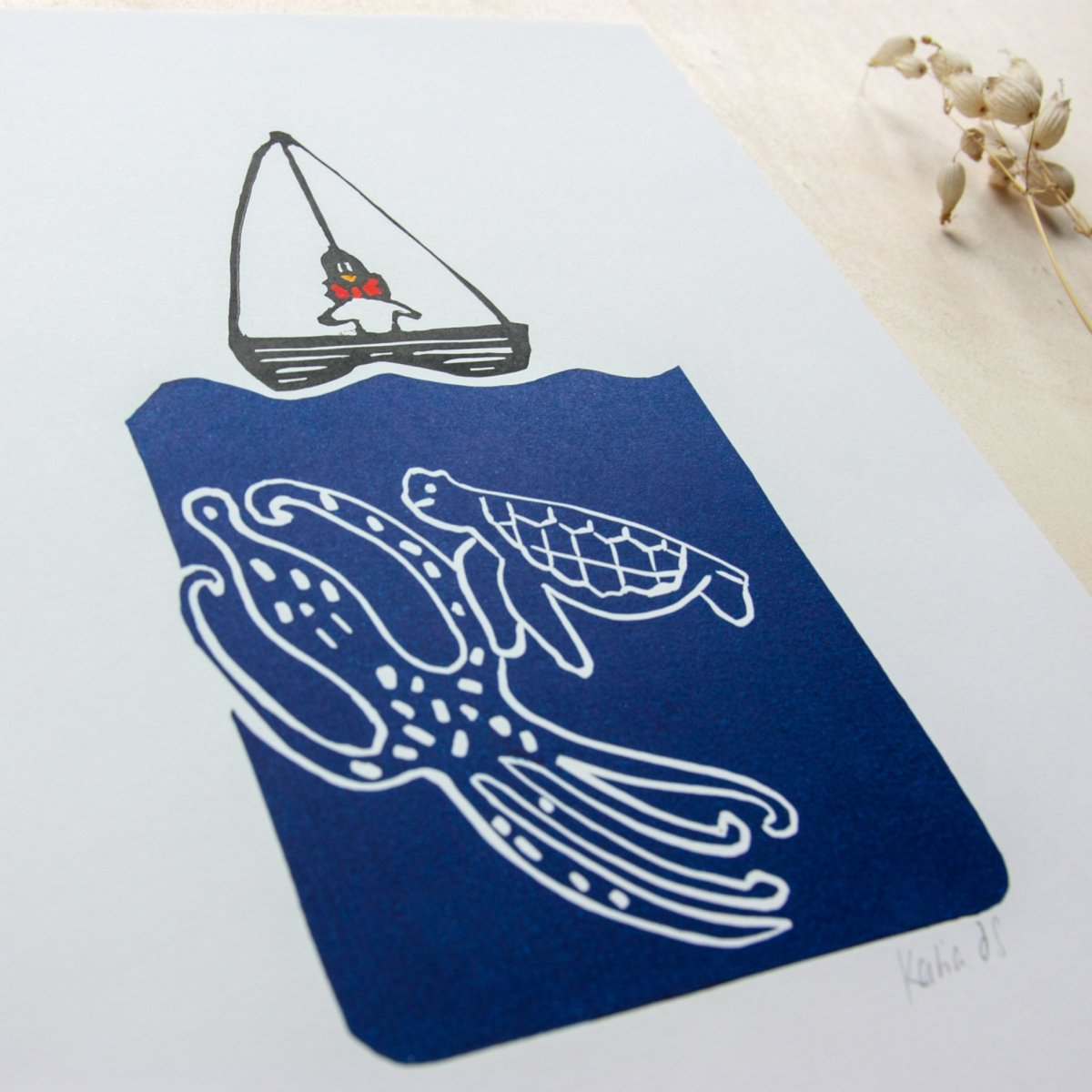 La linogravure est une technique d'impression en relief, semblable à la gravure sur bois, mais réalisée sur une plaque de linoléum. Ce procédé permet de reproduire plusieurs copies d’une image tout en conservant une qualité artisanale. Chaque tirage est unique et peut parfois avoir quelques petites taches ou irrégularités, c’est normal car cela fait partie du processus d’impression.