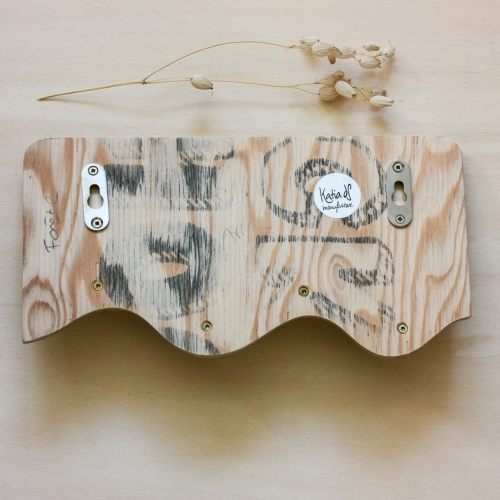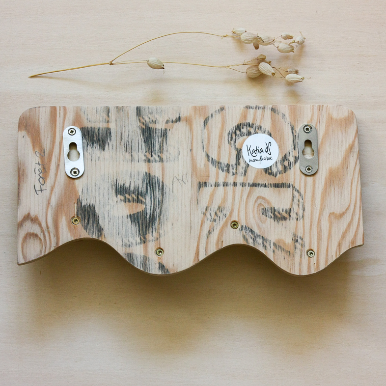 Ce patère réalisée à Prilly-Lausanne est une pièce unique fabriquée entièrement à la main à partir de planches de bois récupérées de la décoration d’un grand magasin lausannois.