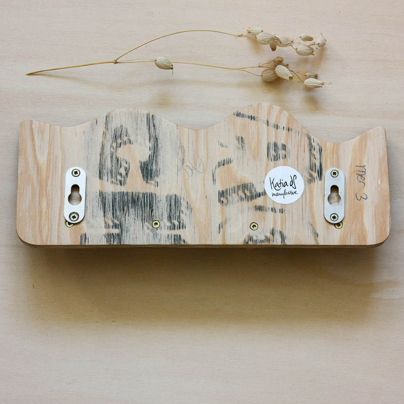 Ce patère réalisée à Prilly-Lausanne est une pièce unique fabriquée entièrement à la main à partir de planches de bois récupérées de la décoration d’un grand magasin lausannois.