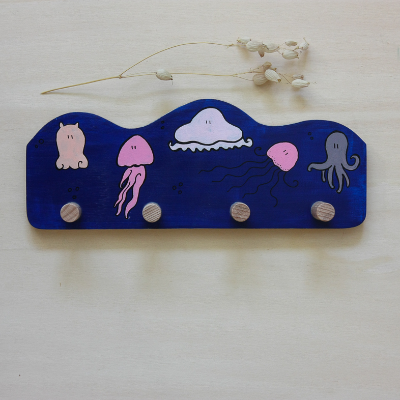 Les personnages, les animaux de la mer, ont été réalisés avec de la peinture acrylique puis vernis.