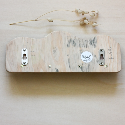 Ce patère réalisée à Prilly-Lausanne est une pièce unique fabriquée entièrement à la main à partir de planches de bois récupérées de la décoration d’un grand magasin lausannois.