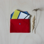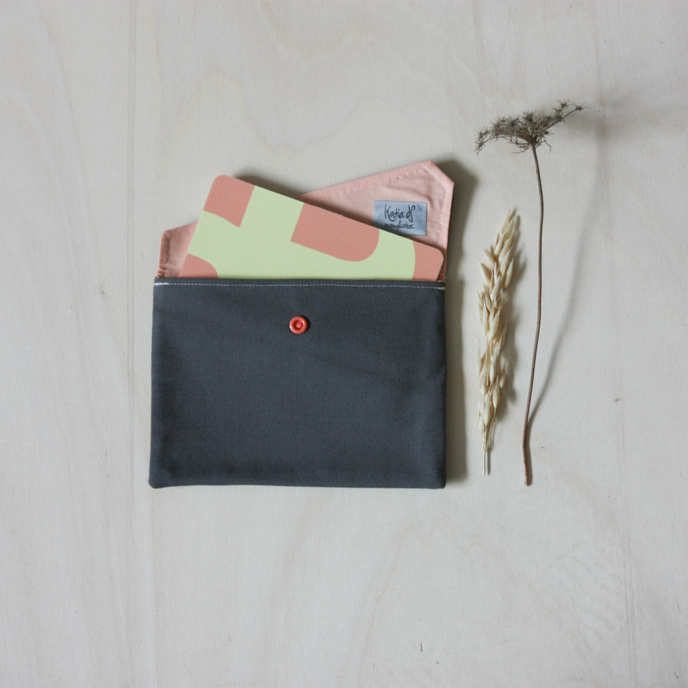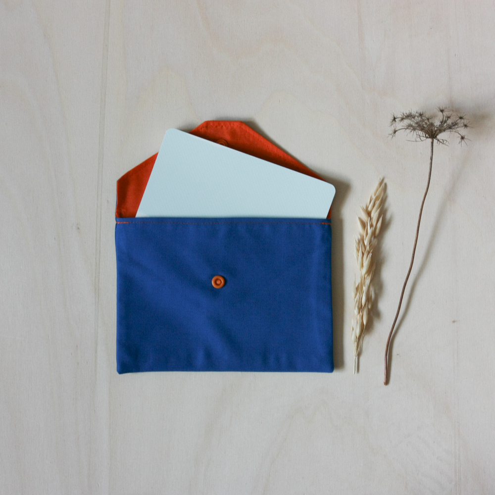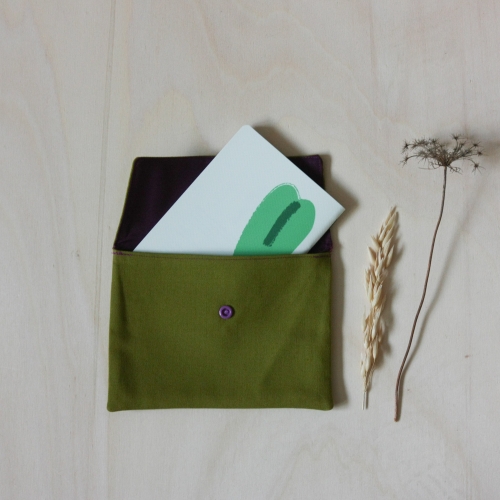 Pochette bicolore avec un bouton pression. Tu peux mettre un cahier A6 ou d'autres choses.