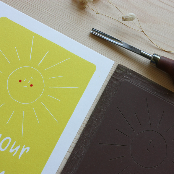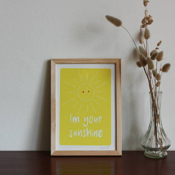 Linogravure "I'm your sunshine" est imprimé dans un jaune vif pour apporter du peps dans votre intérieur. Ce soleil a envie de vous voir rayoner et sourire. On a tous besoin de soleil dans notre vie.