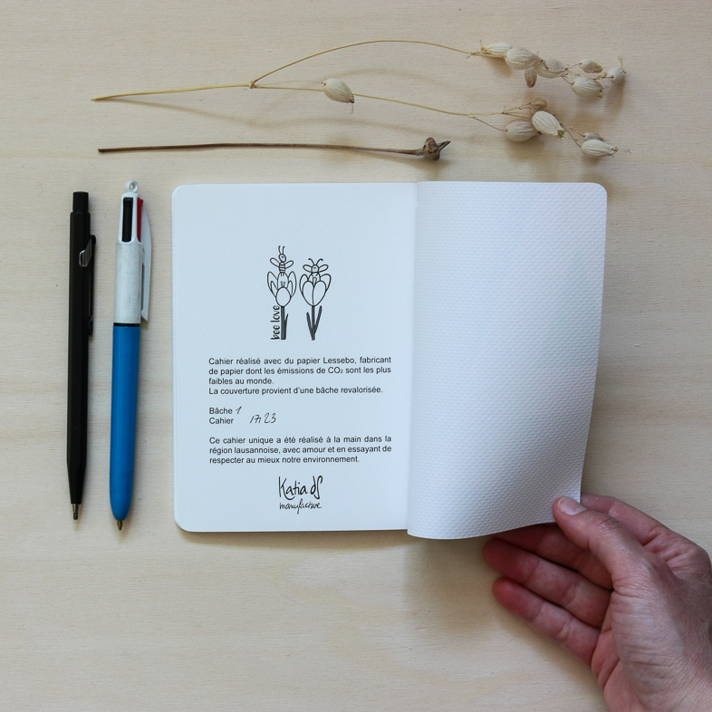 Ce cahier unique a été réalisé à la main dans la région lausannoise, avec amour et en essayant de respecter au mieux notre environnement.