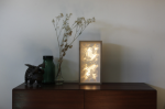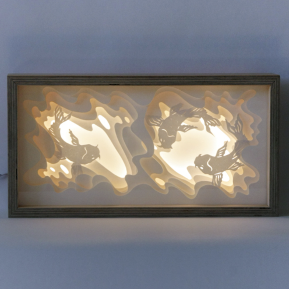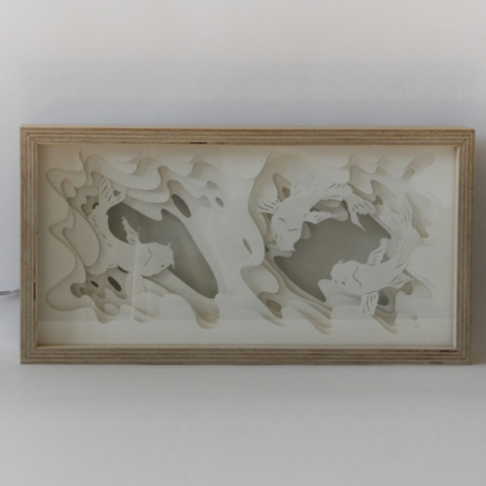 Le rêve lumineux se matérialise dans une boîte en bois : Un petit scénario unique, constitué de 5 couches de papiers découpés à la main et rétroéclairés qui donne vie à un univers onirique et fantastique.