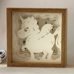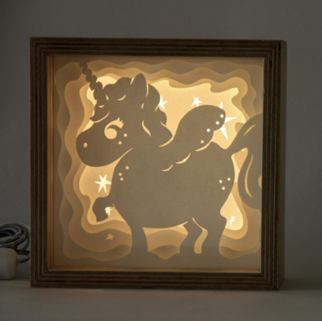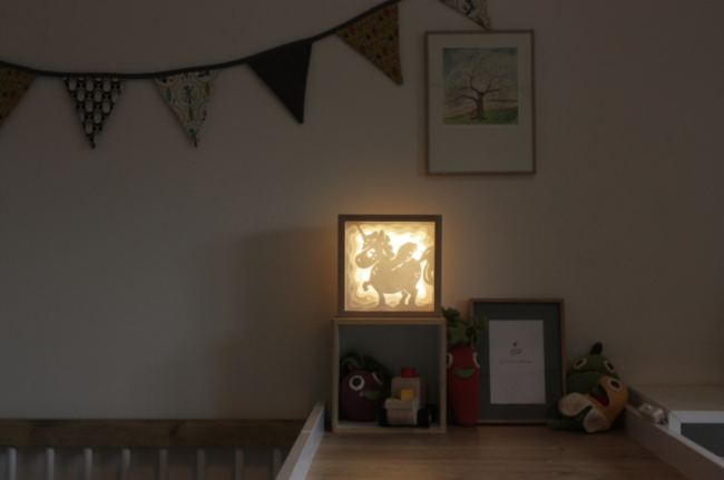 Le rêve lumineux se matérialise dans une boîte en bois : Un petit scénario unique, constitué de 5 couches de papiers découpés à la main et rétroéclairés qui donne vie à un univers onirique et fantastique.