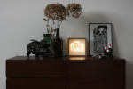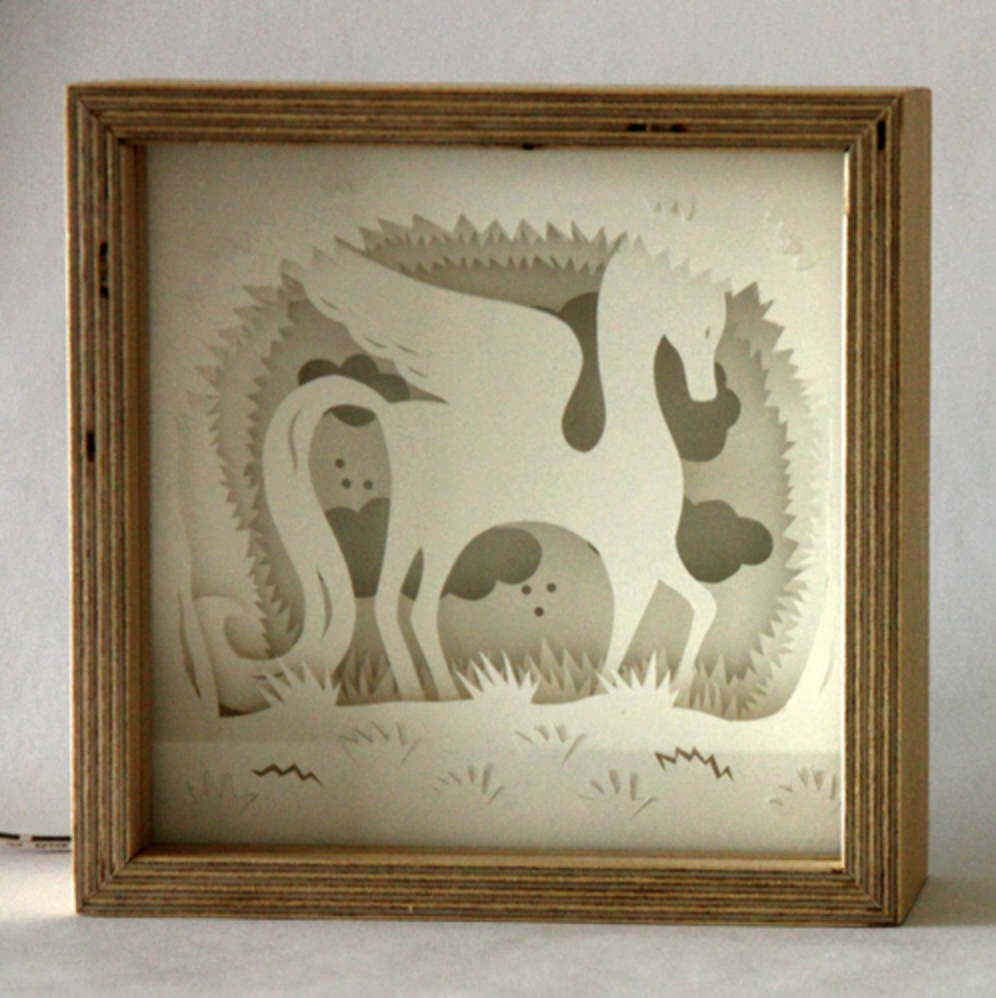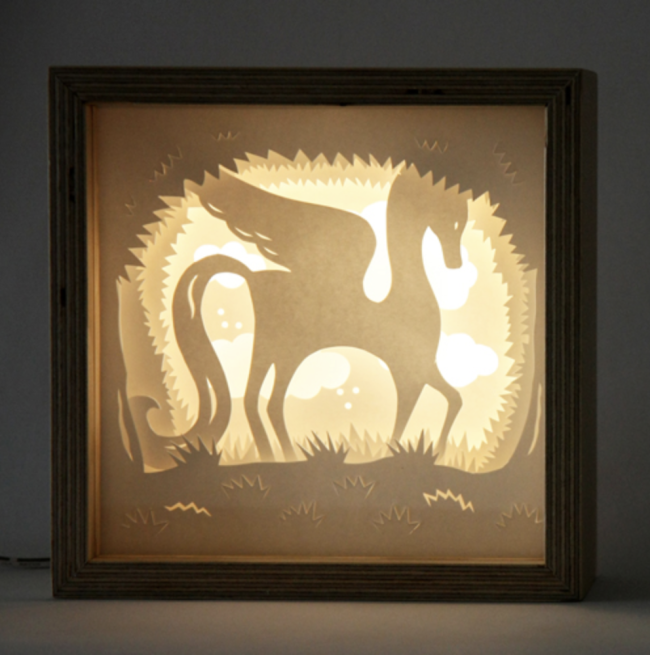 Le rêve lumineux se matérialise dans une boîte en bois : Un petit scénario unique, constitué de 5 couches de papiers découpés à la main et rétroéclairés qui donne vie à un univers onirique et fantastique.