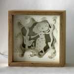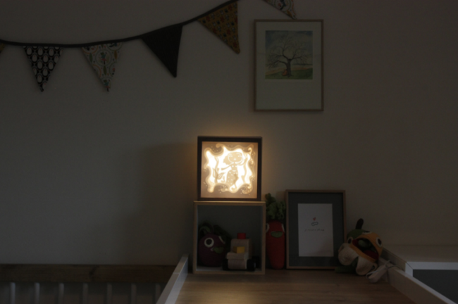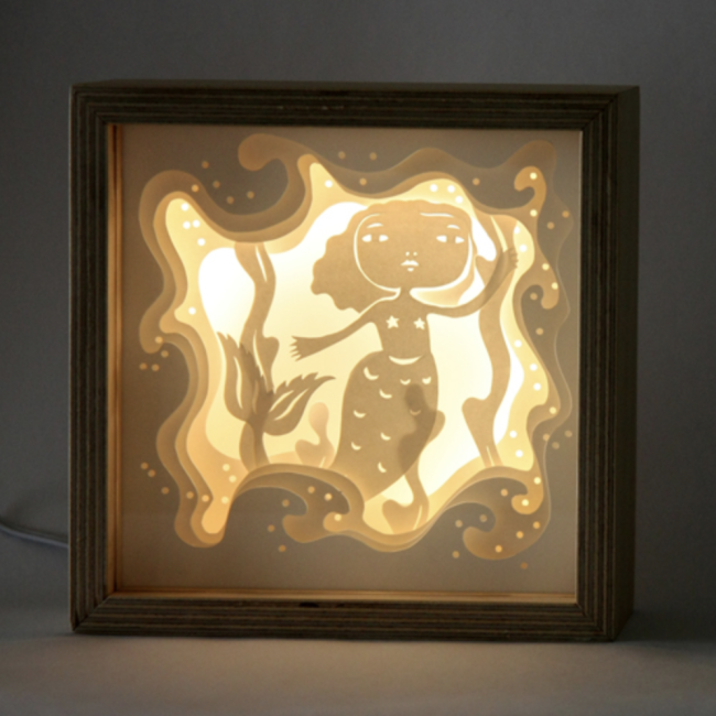 Le rêve lumineux se matérialise dans une boîte en bois : Un petit scénario unique, constitué de 5 couches de papiers découpés à la main et rétroéclairés qui donne vie à un univers onirique et fantastique.