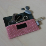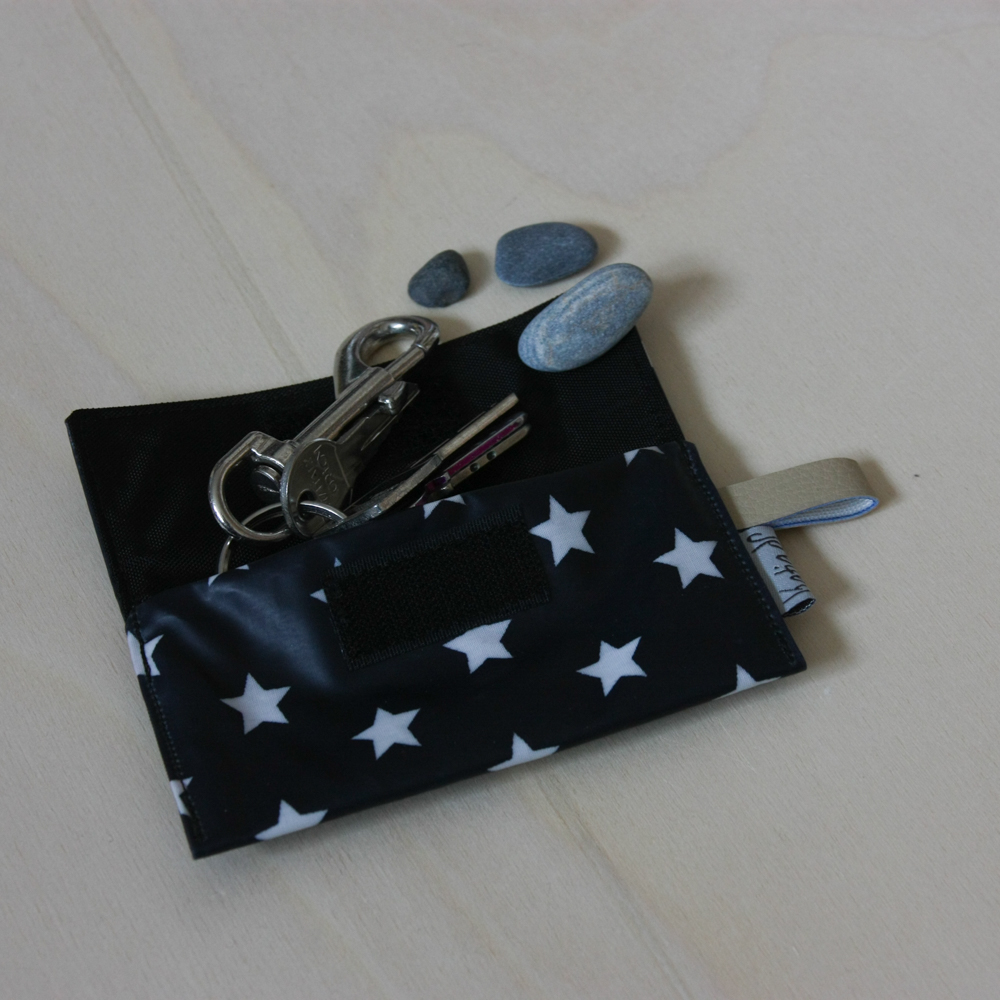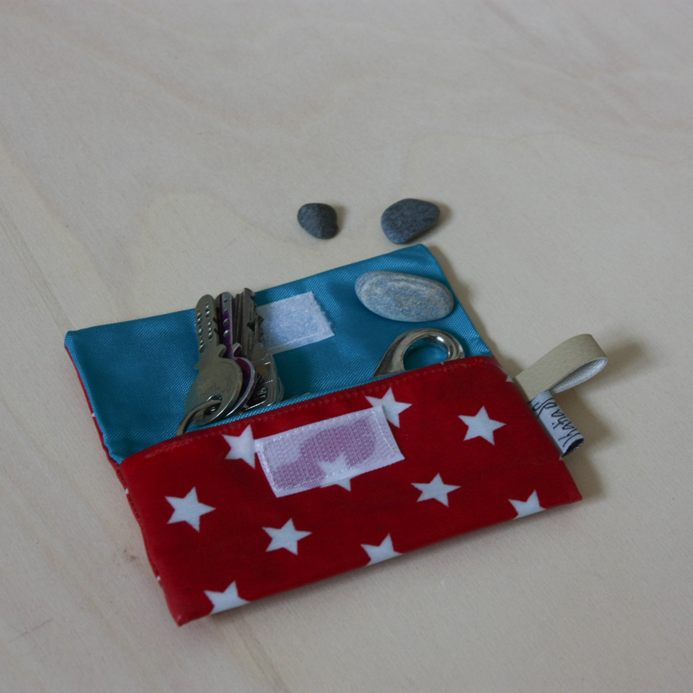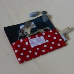 Porte-cartes ou clés en toile cirée. Il y a une petite anse à l'extérieur et à l'intérieur de la pochette afin de mettre tes clés à l'intérieur, ou à l'extérieur.